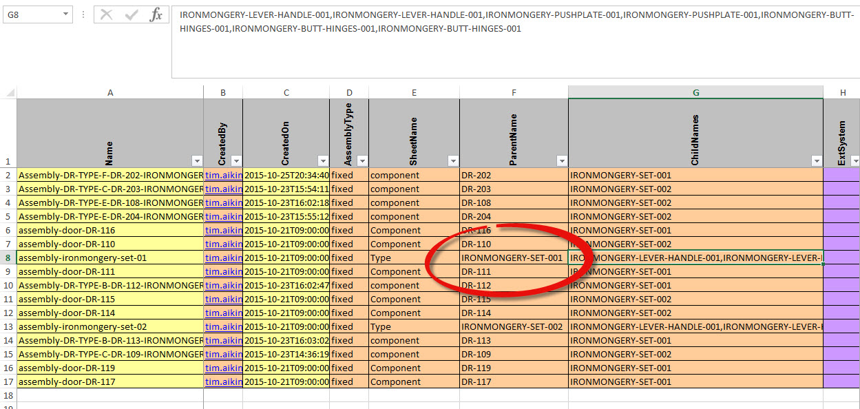 Within Ironmongery packs there are multiple instance of the same item such as hinges. To capture this the ChildNames string will need to include multiple entries and for on item per row the record needs to be repeated for the number of instances.
