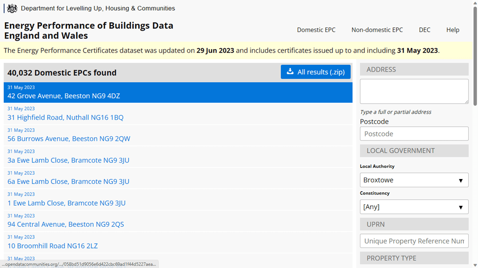 You can find EPC data for an area by visiting the Energy Performance of Buildings Data England and Wales website⁴. The website provides access to Energy Performance Certificates and Display Energy Certificates data for buildings in England and Wales. The data is searchable, browsable and downloadable individually or in bulk. You can register for access to the data on the website.